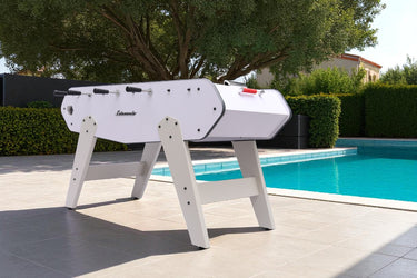 Tempted by an outdoor foosball table? Foosball fans can take their passion into the garden with an outdoor foosball table specially designed for outdoor use. Have your children invited friends over for an afternoon in the garden? This is the perfect entertainment for them to have a great time! But adults also have their own dedicated outdoor foosball table. From intermediate to professional level, our outdoor foosball tables are available in numerous versions for all player profiles. Outdoor foosball tables that stand up to anything! Rain, UV rays, and insects won't harm the sturdiness of our outdoor foosball tables. Their ultra-resistant materials give them great strength even in bad weather. The extreme robustness of their structure, their moisture-treated wood, their UV-resistant paint, their high-strength steel bars guaranteed to be anti-corrosion, and finally their players made of indestructible plastic ensure their flawless durability. You could set up your outdoor foosball table in the middle of the forest to enjoy nature during your training sessions! Just because an outdoor foosball table is durable doesn't mean you shouldn't take care of it! Just remember to cover it with its protective cover. In winter, it's also recommended to store it in a dry place away from light. By cleaning its screws and bolts with a dedicated cleaning product, you'll preserve its color and waterproofing. Outdoor foosball tables were designed for nature and are therefore perfectly suited to outdoor establishments. Recreation centers, campsites, and other sports centers don't have to hesitate for a moment!